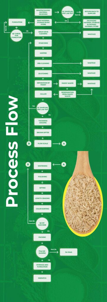 In our Mill, each grain of rice is processed for perfection. Procedures like paddy separation, de-stoning, polishing, grading, and color sorting of the rice grains are done automatically by high tech machines. Quality packed rice is only allowed into the market after it has passed through strict quality control measures at every stage of processing as well as in our well equipped, modern laboratory. Such detailed care and attention guarantees that SUPER BASMATI RICE will always give you a delicious meal of long and fluffy rice grains with an exotic aroma.
